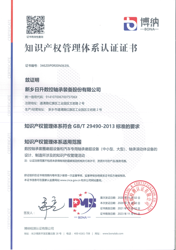 (發(fā)布時(shí)間:2020-12-04 點(diǎn)擊:22645)近日,新鄉(xiāng)日升公司順利通過(guò)知識(shí)產(chǎn)權(quán)管理體系認(rèn)證。認(rèn)證范圍包括 “數(shù)控軸承套圈磨超設(shè)備和汽車(chē)專用軸承磨超設(shè)備(中小型、大型)、軸承滾動(dòng)體設(shè)備的設(shè)計(jì)、制造所涉及的知識(shí)產(chǎn)權(quán)管理活動(dòng)”。