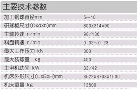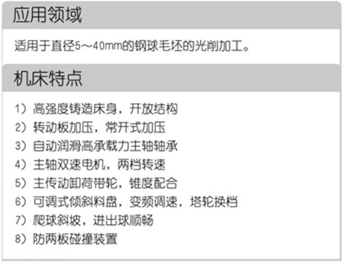 本機(jī)床采用臥式布局和循環(huán)加工方式。主機(jī)床身重約5000kg,內(nèi)部加強(qiáng)筋布局合理,以提高強(qiáng)度,機(jī)床耐沖擊性和抗變形能力增強(qiáng)。主機(jī)與主傳動(dòng)分離,料盤采用傾斜方式,料盤的旋轉(zhuǎn)采用交流變頻調(diào)速。進(jìn)球口處增加爬球坡道,直接從料盤切線處進(jìn)球。加壓方式采用液壓驅(qū)動(dòng),蓄能器保壓裝置。通過改變雙速電機(jī)的極數(shù)可得到主軸兩檔轉(zhuǎn)速。